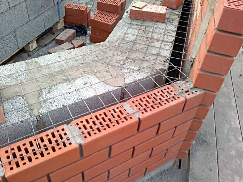 Поперечное армирование: При этом виде армирования чаще всего используется кладочная сетка для кирпича. Ее можно приобрести уже готовой или создать самостоятельно из отдельных прутков, соединенных проволокой. Для обычных стен, специалисты рекомендуют использовать прутья диаметром от 5 до 8 мм. Применение более толстой арматуры может привести к увеличению толщины кладки, что негативно скажется на прочности. Частота поперечного армирования составляет примерно 2-5 рядов. Если выбраны толстые кирпичи, сетка укладывается через каждые 4 ряда. Иногда используется зигзагообразная сетка: она укладывается в соседних рядах, чтобы стержни пересекались перпендикулярно. При армировании следите, чтобы концы арматуры торчали из стены не менее 3-5 мм – это обеспечит контроль над их положением. Для дополнительной прочности рекомендуется использовать раствор марки 50. После завершения армирования выступающие части арматуры заполняют раствором, чтобы избежать коррозии. Поперечное армирование активно используется при постройке наклонных и арочных конструкций. Предпочтительнее приобретать готовую сварную сетку для экономии времени.